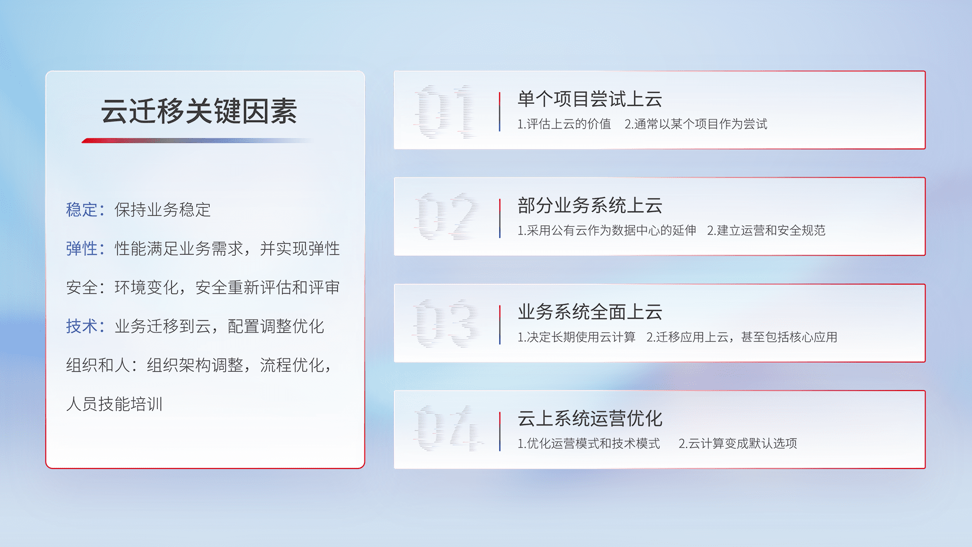 结合实际业务,,从规划设计、、、、云平台选型、、、、云原生改造、、、数据迁移、、集成交付,,,,迁移全过程为客户识别最佳上云路径,,,,做好风险识别管理,,设计网络架构、、、、身份权限、、安全审计合规、、、、操作审计、、、日志审计、、监控告警策略、、、多站点容灾设计等,,,对云上基础设施进行整体规划,,提升IT治理水平,,以满足弹性、、、、高可用、、、、高性能的需求。。。。