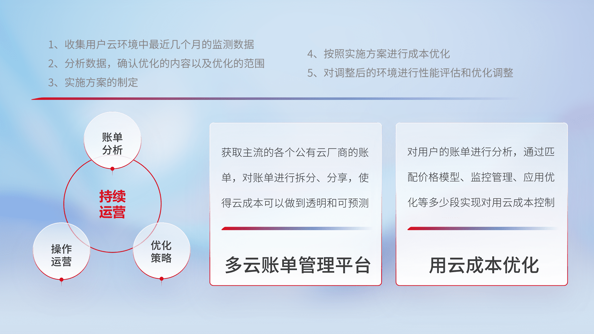 通过多云纳管,,以统一的资源数据模型把客户的云资源进行抽象和封装,,,进而实现对多云资源的统一操作,,,,保障云资源管理的可靠性、、、、稳定性与可用性。。。量身定制化运维内容,,配置、、、、开发运维、、、补丁管理、、备份、、监控、、认证和访问管理、、、审计和日常巡检等,,,,保障在用云过程中的可靠度,,,,稳定度以及高可用率。。